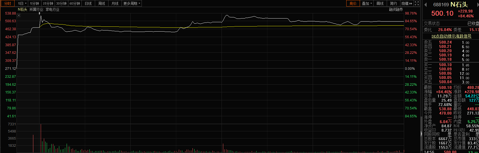 A股最贵新股科创板石头科技开盘上涨73.35%,盘中一度冲高至538.88元,截至收盘涨84.46%,收报500.10元/股,成科创板“新股王”。全天成交量1129.02万股,成交额54.22亿元,换手率72.68%。