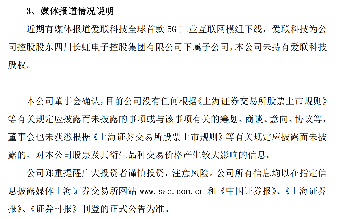 2月25日晚间,四川长虹发布公告表示,近期有媒体报道爱联科技全球首款5G工业互联网模组下线,爱联科技为公司控股股东四川长虹电子控股集团有限公司下属子公司,公司未持有爱联科技股权。