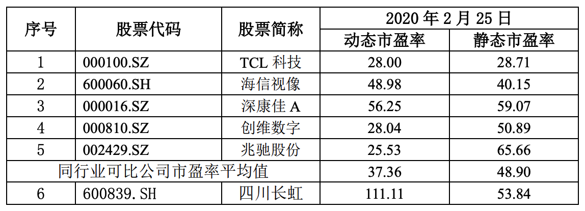四川长虹在公告中表示,公司从Wind选取与公司同行业其他上市公司为可比上市公司,公司股价剔除大盘整体因素后涨幅较大,公司静态市盈率为53.84,动态市盈率为111.11,市盈率水平高于家电(黑电)行业平均市盈率水平。