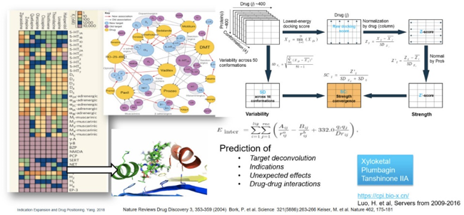 我国科研工作者为此开发出了「化合物-蛋白互作组」(Chemical-protein interactome,简称CPI)[8]的研究项目。CPI 尽可能地穷尽了全部的上市药物和全部的人类可药性蛋白,进而得到了记录各种靶药「对子」结合强度的数据矩阵。