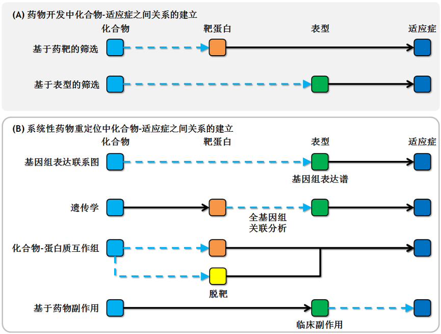 △图 1:药物开发(A)与基于大数据的系统性药物重定位(B)在联通化合物和适应症之间关系的策略