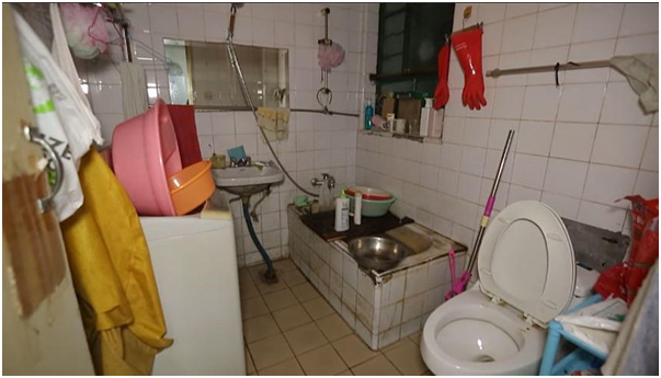 洗浴、洗漱、洗衣、如厕功能分别散落在卫生间各处,由于湿气较重,缺少排气设备,洗澡时犹如在桑拿房,而且过多的水汽会导致滑倒事故。