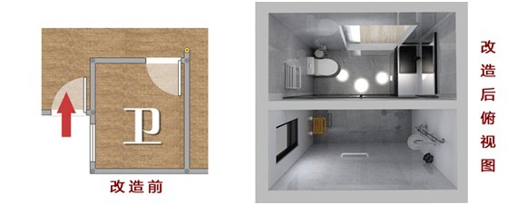 设计师将卫生间门向右移动,为洗漱池腾出足够的空间,更合理的规划了洗漱、洗浴以及如厕动线。