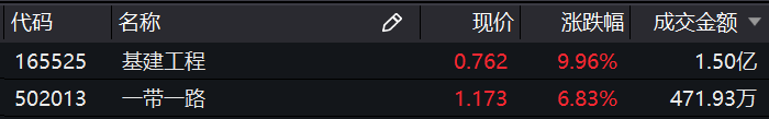 对于前者而言,A股相关板块以大涨迎接,基建央企以及建材等相关个股爆发,上峰水泥(000672.SZ)、中国铁建(601186.SH;01186.HK)等多股涨停。场内基金虽然数量不多,但涨幅靠前,基建工程尾盘涨停。