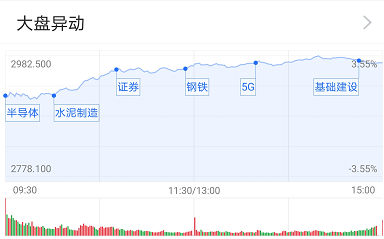 在经历了上周的大跌后,A股今日强势反弹。开盘科技股发力,5G概念火热,由于7省市推出25万亿重点项目,大基建板块爆发,加上新证券法于3月1日正式实施,非银金融板块也走势强劲,三大指数早盘涨幅均在3%以上。午后市场热度不减,钢铁板块有所表现,大基建板块强者恒强,申万建筑材料指数大涨超8%。