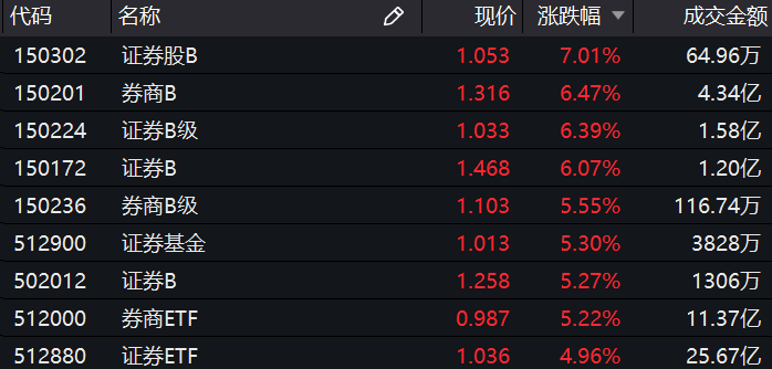 而受益于新证券法的实施,券商龙头中信证券(600030.SH;06030.HK)、华泰证券(601688.SH;06886.HK)等涨幅均超4%。场内券商主题基金随之上涨,券商B(502055.SH;150201.SZ)、证券B(502012.SH;150172.SZ)等涨幅相对靠前,券商ETF(512000.SH)、证券ETF(512880.SH)等涨幅均在4%以上。