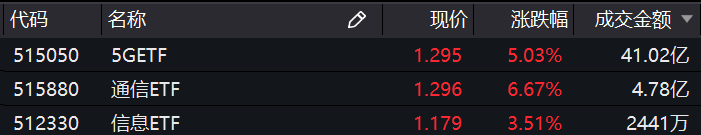 除了传统基建板块大涨外,5G新基建也是行情火爆,场内基金5GETF(515050.SH)涨超5%,通信ETF(515880.SH)、信息ETF等均有不俗表现。