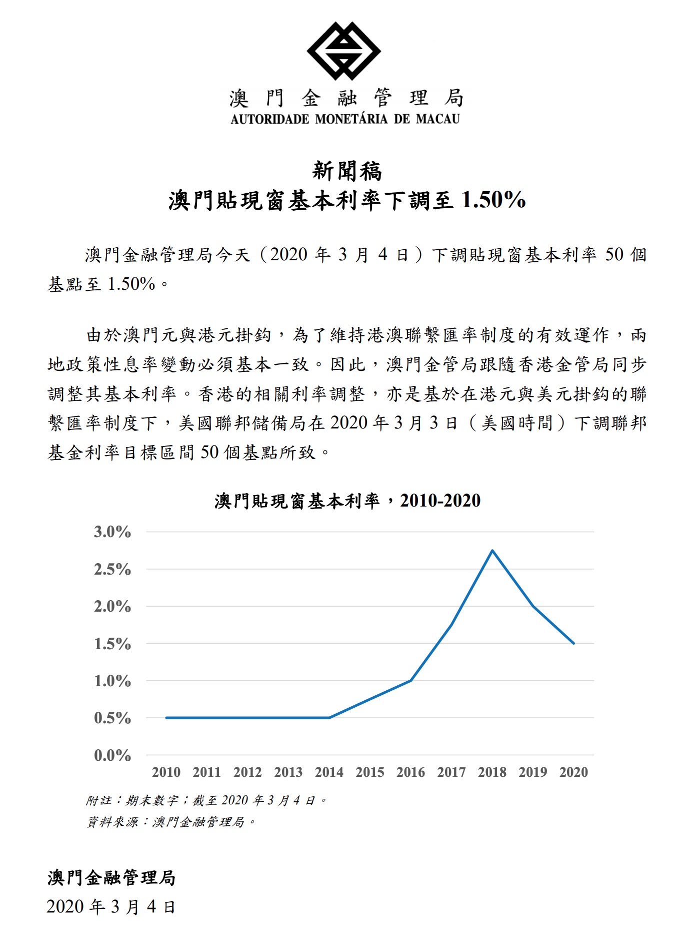 3月4日,澳门金管局下调贴现窗基本利率50个基点至1.50%。