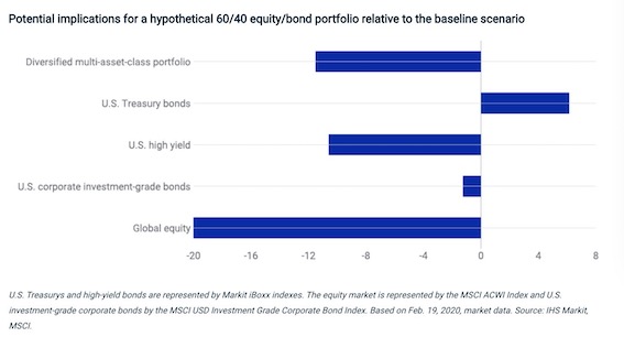 正是鉴于疫情对金融市场的影响可能超出预期,因此MSCI继2月初的压力测试后,又对测试进行了更新。MSCI运用了新的宏观经济模型来预测一个严重但短期内可能发生的下行情境。美国股市从2月19日到3月4日间已下跌11%,极端情况下,MSCI的模型预测未来可能会再跌11%(总计跌幅22%)。另外,60/40 (股/债)配比的全球多重资产类别的投资组合也可能再跌7%(总计跌幅12%),在这一组合中,全球股市可能会跌超10%,其中债券涨2%,部分抵消了股票的跌幅。