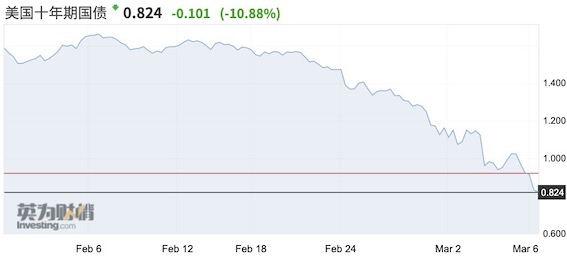 截至北京时间3月6日,美国10年期国债收益率已经进一步大跌至0.82%。本周初美国10年期国债在美联储紧急降息后首度跌破1%,创历史新低。