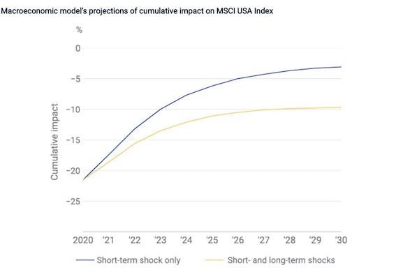 若全球经济只是承受短期冲击,MSCI认为市场可能会在不确定性消散后反弹。然而,若长期增长及公司盈利因疫情而维持在低增速轨道,那么市场影响可能会持续更久。更长时间看到2030年,MSCI的模型显示,乐观情境下,疫情对美股的累积影响可能会改善至-3%(极端时-22%)。冲击可能只是短期的,但若是在更悲观的情境下,也可能只能改善至-10%。