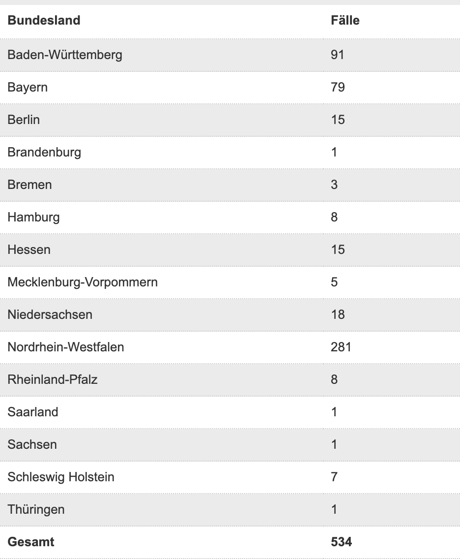 据德国疾病防控机构罗伯特·科赫研究所6日公布的数据,截至当地时间6日7时,德国新冠肺炎确诊病例上升至534例。与该所5日8时公布的数据相比,新增185例。