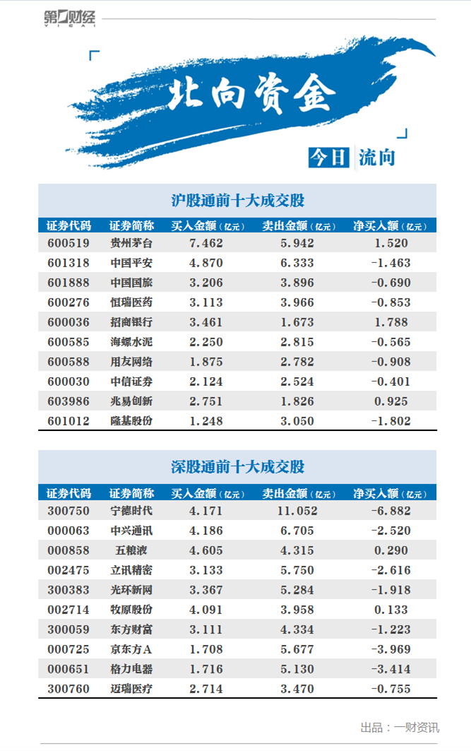 今日前十大成交股中,净买入额居前三的是招商银行、贵州茅台、兆易创新,分别获北向资金净买入1.79亿元、1.52亿元、0.93亿元。净卖出额居前三的分别是宁德时代、京东方A、格力电器,净卖出额为6.88亿元、3.97亿元、3.41亿元。