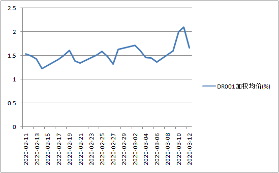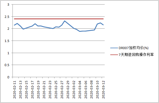 这种宽松态势自年后开市以来一直在持续,除了开市首日流动性出现阶段性紧张外,而后的一个多月资金利率连连下行,短端利率下行更为明显。截至3月12日,DR001(银行间隔夜质押式回购利率)加权平均利率连续24个交易日位于2%以下,最低值为1.22%。截至当日下午收盘,DR007加权平均利率报2.1598%,DR001加权平均利率报1.6594%。