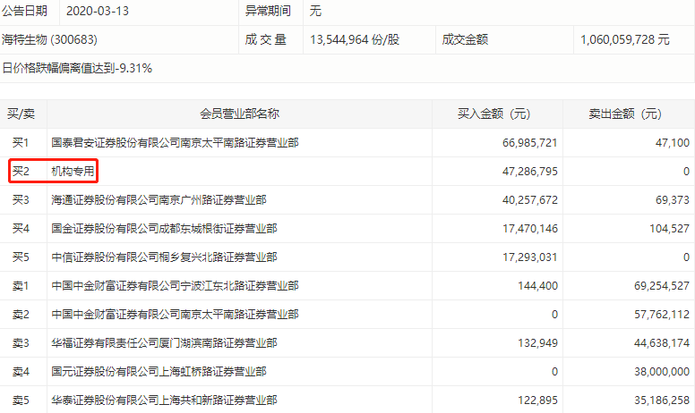 当天机构净买入前三的股票分别是海特生物、福日电子、博杰股份,净买入金额分别是4729万元、2458万元、2242万元。
