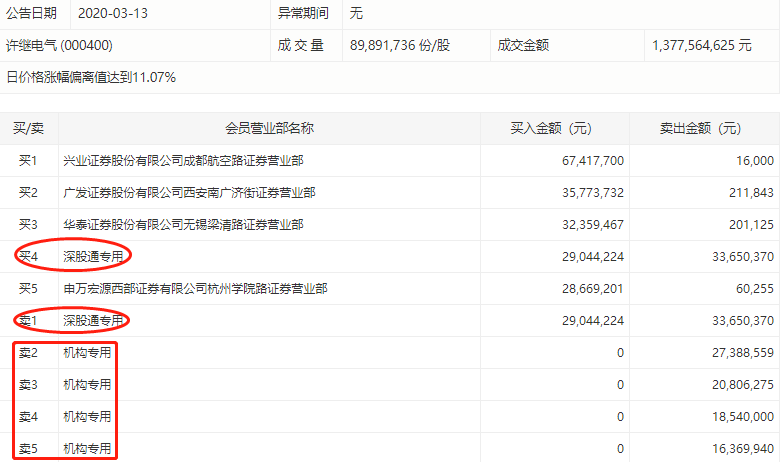 在卖出排行榜上,机构卖出最多的许继电气有4家机构席位和1家深股通席位卖出,1家深股通席位买入,净卖出金额为8310.48万元。