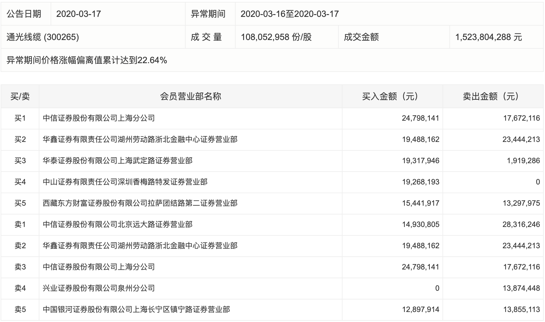 因属于连续三个交易日内,涨幅偏离值累计达20%的证券,通光线缆股17日还登上了龙虎榜。龙虎榜数据显示,今天前五大营业部共买入1.7亿元,卖出1.53亿元,净买入1693.37万元。