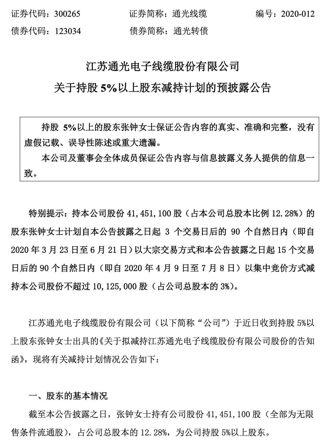 此外,通光线缆晚间还发布公告称,持公司12.28%股权的股东张钟,计划减持公司股份不超过公司总股本的3%。