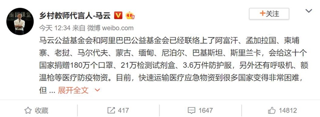 3月21日中午,马云在新浪微博公开表示,马云公益基金会和阿里巴巴公益基金会已经联络上了阿富汗、孟加拉国、柬埔寨、老挝、马尔代夫、蒙古、缅甸、尼泊尔、巴基斯坦、斯里兰卡,会给这十个国家捐赠180万个口罩、21万检测试剂盒、3.6万件防护服,另外还有呼吸机、额温枪等医疗防疫物资。