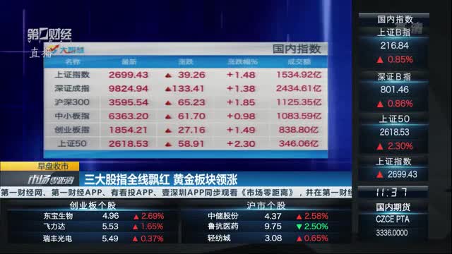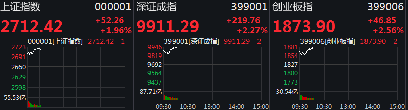 A股市场上,上证指数高开1.61%重回2700点,深成指高开2.15%,创业板指开盘涨2.3%。板块几乎全线飘红,黄金、有色、券商、5G、通信、半导体等板块领涨。截至发稿,A股三大股指均涨超2%。