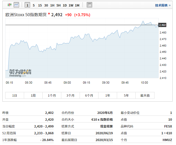 欧洲主要期指全线走高,欧洲Stoxx 50指数期货大涨3%。