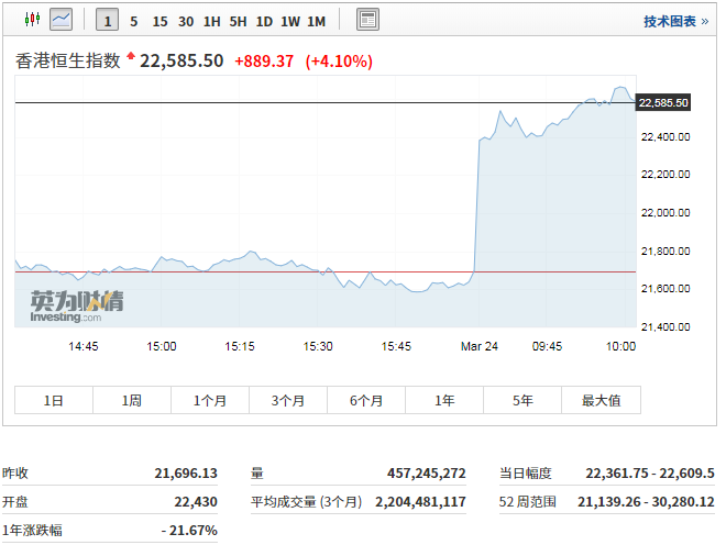 香港恒生指数高开3.69%,国企指数涨4.29%,红筹指数涨4.37%。截至发稿,香港恒生指数涨逾4%。