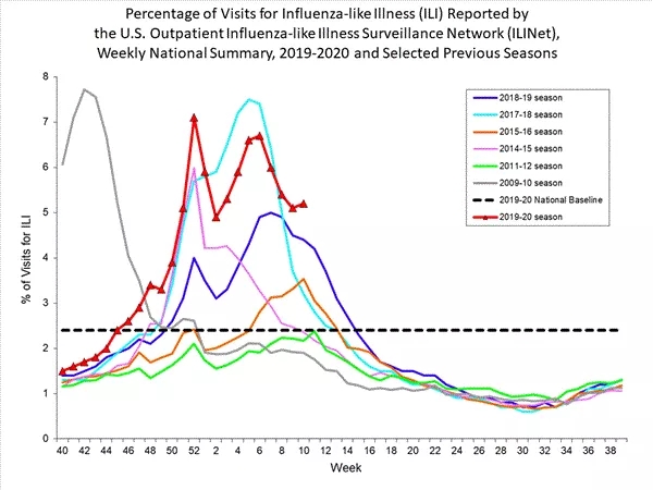 流感样病例(influenza-like illness, ILI)的比例,也就是ILINet覆盖门诊病例中具有流感症状的病例比例,是监测流感爆发程度的重要指标。每年CDC会依据非流感季节的情况来测算一个全国基准线数字,当流感样病例比例超过这条线,就意味着流感开始爆发。