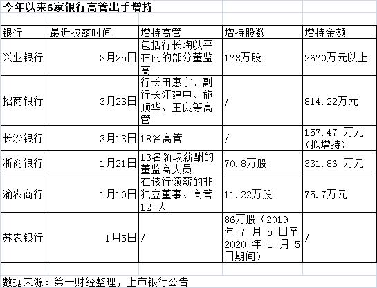 在兴业银行之前,招商银行部分高管也进行了增持。根据港交所披露信息,3月23日,招商银行行长田惠宇、副行长汪建中、施顺华、王良等高管从二级市场买入该行股票,成交均价为30.03元至30.3元/股,共计买入814.22万元。