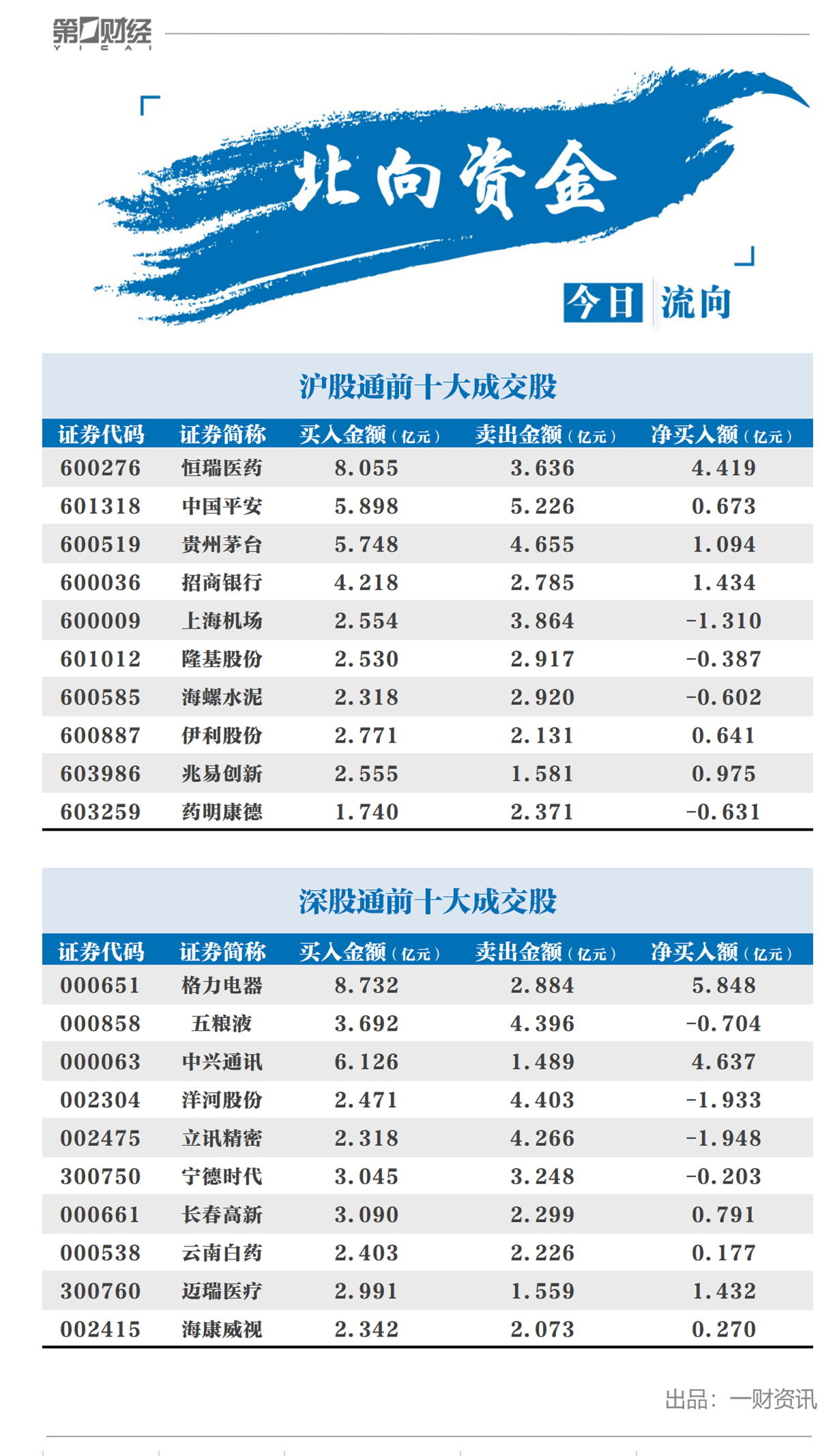 今日前十大成交股中,净买入额居前三的是格力电器、中兴通讯、恒瑞医药,分别获北向资金净买入5.85亿元、4.64亿元、4.42亿元。净卖出额居前三的分别是立讯精密、洋河股份、上海机场,净卖出额为1.95亿元、1.93亿元、1.31亿元。