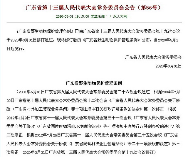 昨日(3月31日)召开的广东省第十三届人民代表大会常务委员会第十九次会议修订通过了《广东省野生动物保护管理条例》(下称《条例》)。该《条例》全文于当晚对外公布,自2020年5月1日起施行。