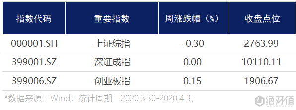 截至周五(4月3日)收盘,沪指当周累计跌幅0.3%,报2763.99点;深成指本周涨平,报10110.11点;创业板指周涨幅为0.15%,收于1906.67点。