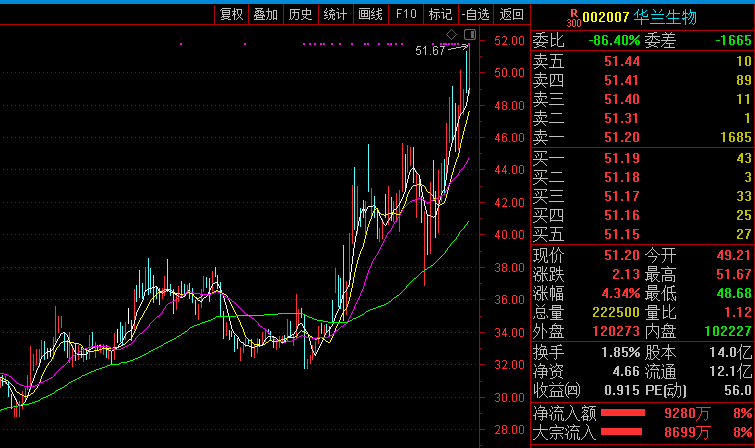 盘面上,华兰生物今日收盘大涨4.34%,股价创出历史新高。