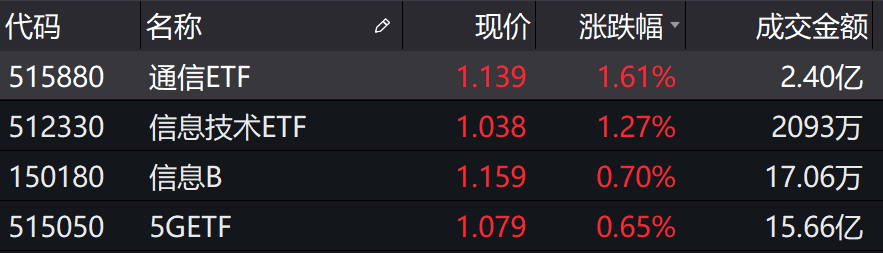 具体来看,通信板块中,场内基金通信ETF(515880.SH)、信息技术ETF涨逾1%;信息B(150180.SZ)、5GETF(515050.SH)也表现上涨。