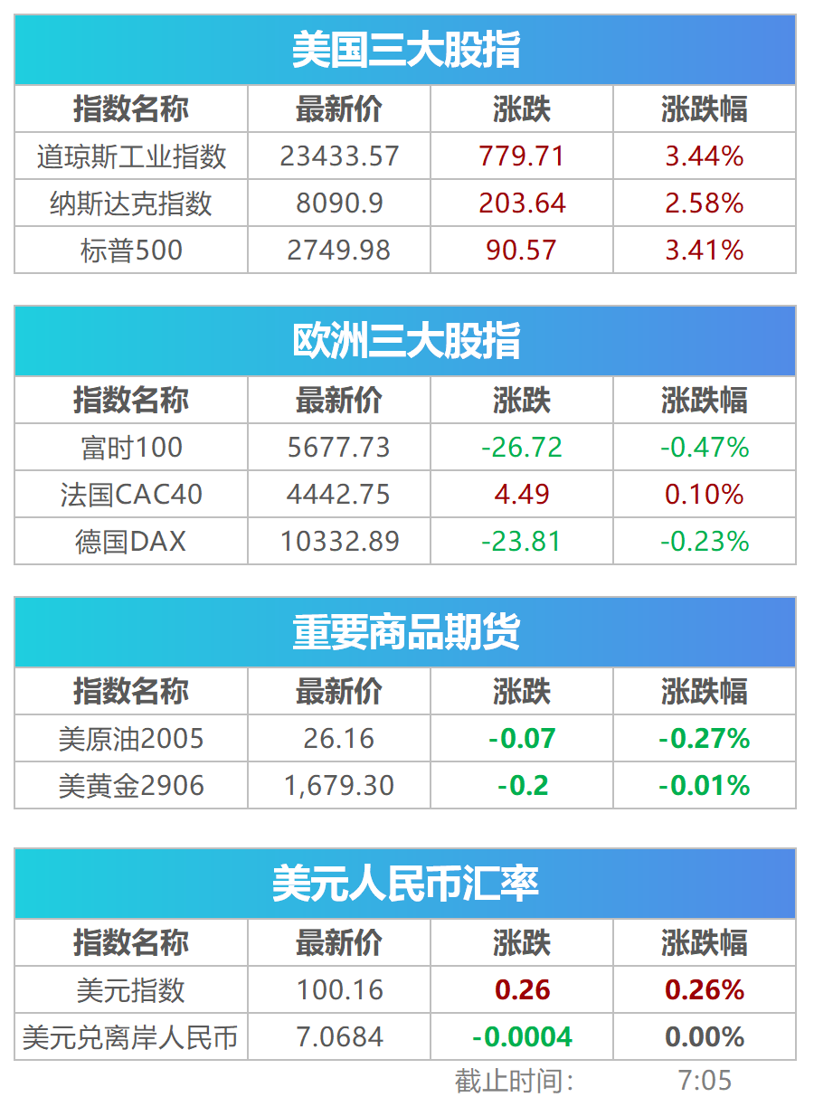 周三美股高开高走,道琼斯工业平均指数上涨3.44%,收于23433.57点。标普500指数上涨3.41%至2749.98,纳斯达克综合指数上涨2.58%至8090.90。苹果涨2.56%,联合健康、陶氏化学涨超7%,领跑道指成分股。美股芯片股集体上涨,恩智浦、微芯科技、应用材料涨超8%;中概股普遍走低,爱奇艺、百度、唯品会、斗鱼均跌超4%,教育股好未来跌超6%,阿里巴巴跌超1%。