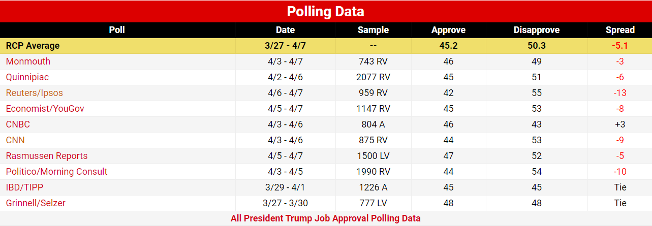 根据美国民调数据聚合网站RealClearPolitics,最新的主要民调基本都显示,受访者对特朗普工作的认可度下滑(下图)。对多项民调取平均值,特朗普总的支持率为45.2%,不支持率为50.3%。