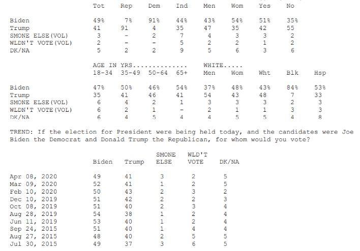 昆尼皮亚克大学 (Quinnipiac University)8日公布的民调显示,特朗普的支持率为46%,不支持率51%。受访民众在被问及 “如果大选现在举行你会投票给谁时?”,49%的人选择投票给拜登,41%的人投票给特朗普。(下图)