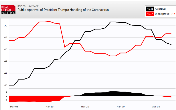 关于特朗普应对疫情的表现,主要民调平均值显示民众的满意度比上周明显下降,不满意度上升(下图)。