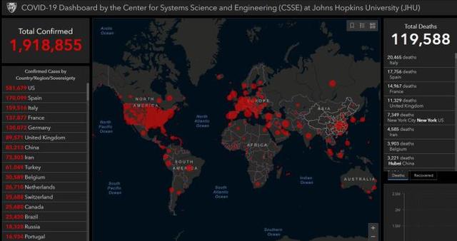 据美国约翰斯·霍普金斯大学实时统计数据显示,截至北京时间9时左右,全球新冠肺炎确诊病例累计为1918855例,累计死亡119588例。