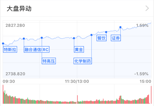 三大股指迎大涨,沪指收复2800点,特斯拉概念、券商股齐欢腾,北向资金马力十足。