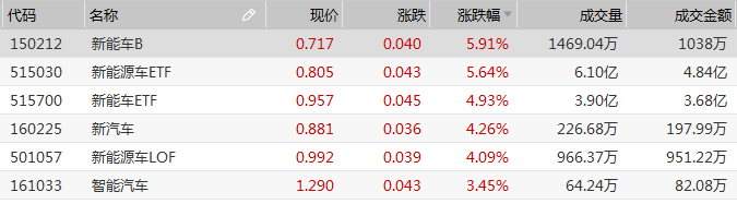 新能源车板块中,新能车B(150212.SZ)、新能源车基金(501057.SH)涨幅均超5%,新能车、新汽车基金(160225.SZ)、新能源车基金(501057.SH)、智能汽车基金(161033.SZ)等多只场内基金跟涨。