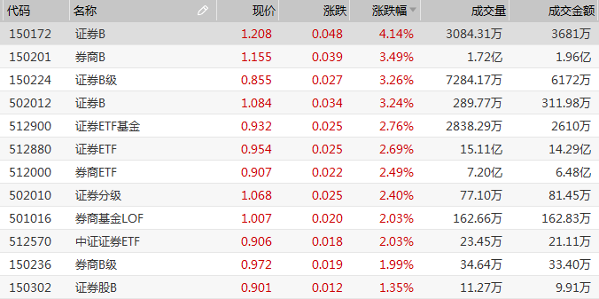 除了新能源车板块强势回归,午后券商板块同样表现亮眼。截至收盘,证券B(150172.SZ)以4.14%的涨幅领跑券商场内基金,券商B(502055.SH;150201.SZ)、证券ETF(512880.SH)、券商ETF(512000.SH)等纷纷涨超3%。