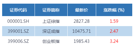 两市全天高开高走,三大指数高歌猛进。早盘在科技、新基建等板块题材的带动下,创业板指稍显强势。午后指数持续走高,在券商股的提振下,三大指数进一步拉升,沪指收复2800点重返5日线上方,创业板指涨逾3%。