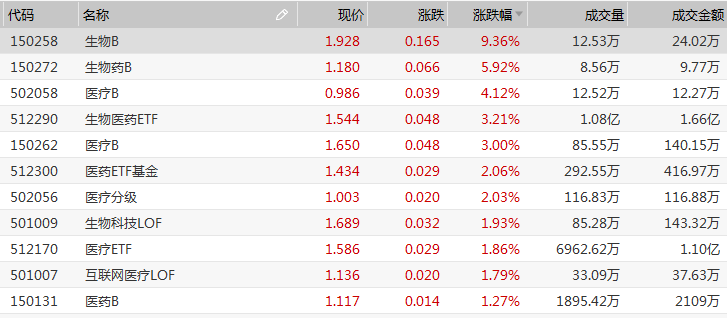 上述板块相关的场外基金有:东方创新科技(001702.OF)、中海积极增利(001279.OF)、中欧时代先锋A(001938.OF)、交银阿尔法核心(519712.OF)、中欧明睿新常态A(001811.OF)、招商国证生物医药(161726.OF)、广发中证医疗(502056.OF)、华宝中证医疗(162412.OF)等。