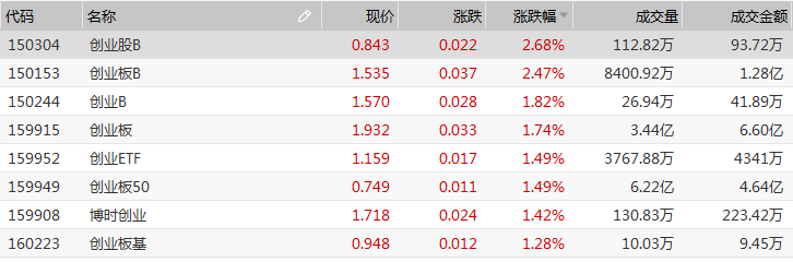 场内创业板基金中,创业股B(150304.SZ)、创业B(150244.SZ)、创业ETF(159952.SZ)等表现优异。