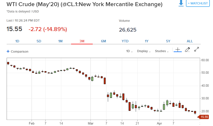4月20日,5月WTI原油期货从18.27美元/桶大幅下挫,最低触及-40.32美元/桶,跌幅超300%,最终收于-37.63美元/桶,创下了全球金融市场的又一神迹,让我们有幸见证了人类历史上第一次“负油价”。4月21日夜,国际原油市场继续血雨腥风,6月合约WTI期货价格继前晚暴跌15.2%后,一度大幅下挫接近70%至6.5美元/桶。