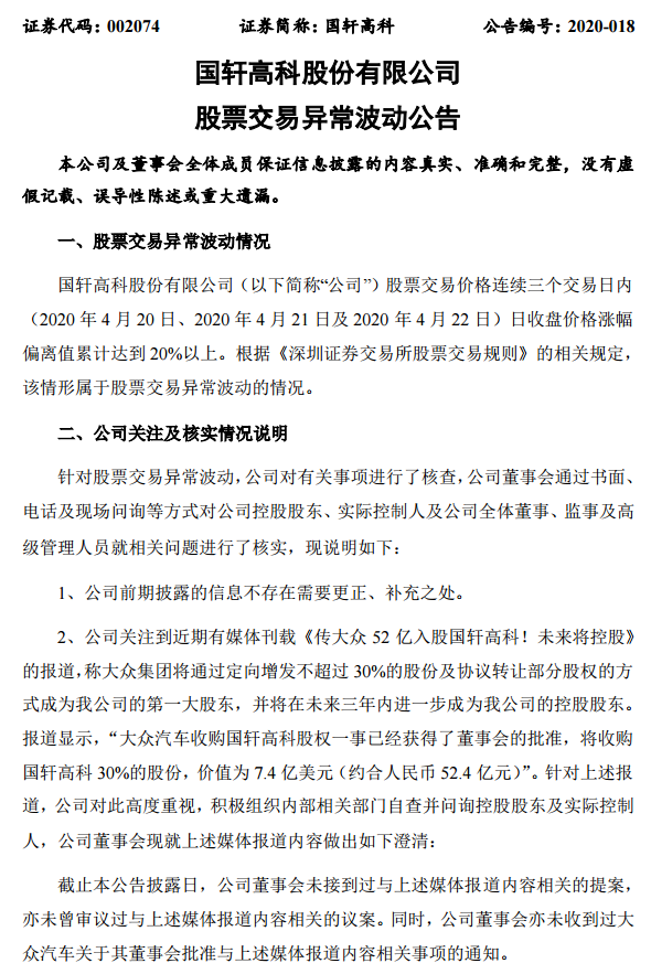4月21日,深交所曾就此报道向国轩高科下发关注函,要求国轩高科说明大众集团将成为公司的第一大股东报道内容是否属实,如否,请予以澄清说明。