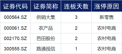 农村电商概念今日持续火爆,供销大集(000564.SZ)三连板,农产品(000061.SZ)、芭田股份(002170.SZ)两连板,路通视信(300555.SZ)涨停,丰乐种业(000713.SZ)、乐普信等个股跟涨。近期各地县市长们频频出现在各电商平台的直播间,化身家乡农产品“代言人”,向全国网友推荐当地因疫情影响滞销的农副产品。除此之外,多家电商平台都推出助农发展计划,布局新农村市场。