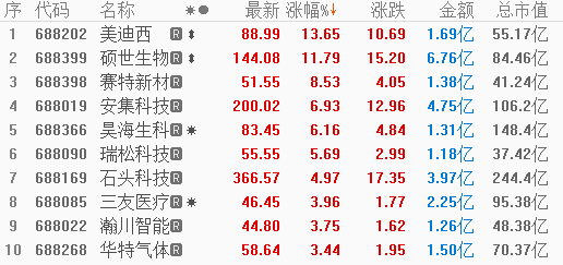 涨幅方面,在医药板块表现低迷的时候,美迪西(688202.SH)、昊海生科(688366.SH)、特宝生物(688278.SH)、华熙生物(688363.SH)等多股逆市上扬,其中美迪西涨逾13%,昊海生科涨逾6%;硕世生物(688399.SH)并没有受到体外诊断板块下跌的影响,收涨11.79%。此外,安集科技(688019.SH)、瑞松科技(688090.SH)、石头科技(688169.SH)等多股现不同程度上涨。