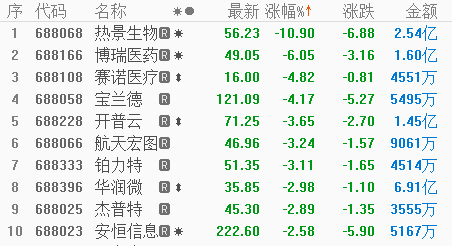 跌幅方面,医药板块的回调走弱,带动了相关个股的下挫,热景生物(688068.SH)跌逾10%,博瑞医药(688166.SH)、赛诺医疗(688108.SH)等跟跌。此外,宝兰德(688058.SH)、开普云(688228.SH)、航天宏图(688066.SH)等多股现不同程度下跌。