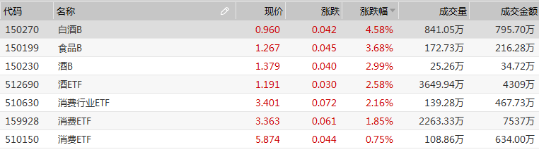 A股横盘震荡,但以白酒为首的必选消费板块表现活跃,申万食品饮料以1.68%的涨幅领跑全行业。基金方面,白酒B(150270.SZ)涨逾4%,食品B(150199.SZ)、酒ETF(512690.SH)、消费ETF(510150.SH;159928.SZ)等场内基金纷纷收涨。